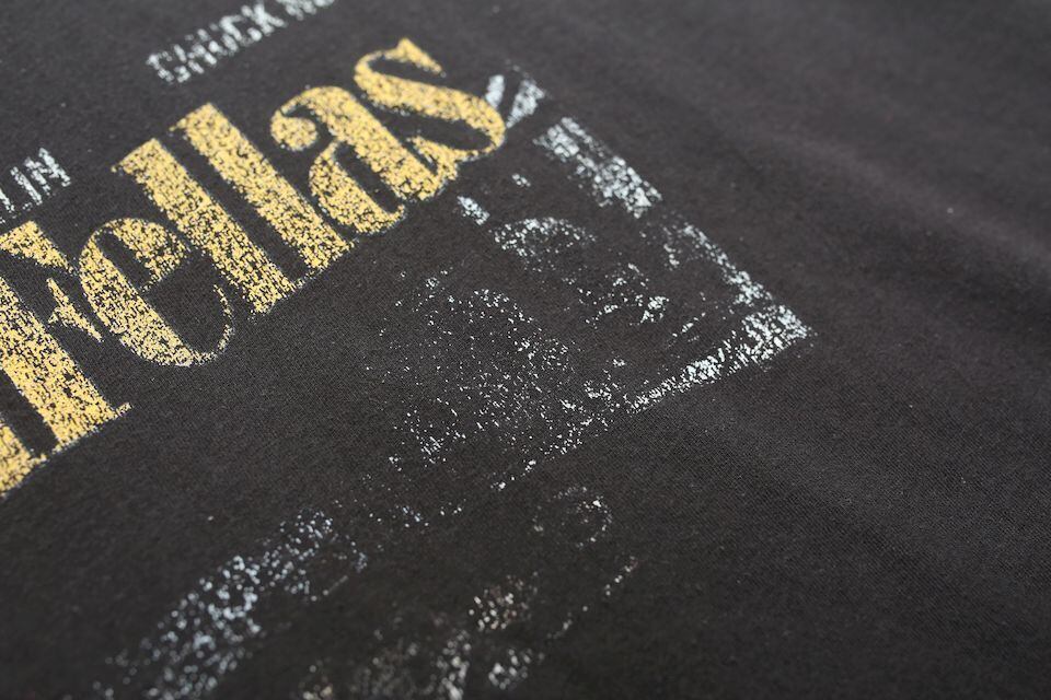 恐らく仲間内で作ったであろう一枚ですがここまでプリントが擦れてるものは多くなく、いわゆる、”誰やねんTシャツ”の中でも群を抜いて”誰やねん”な一枚。
