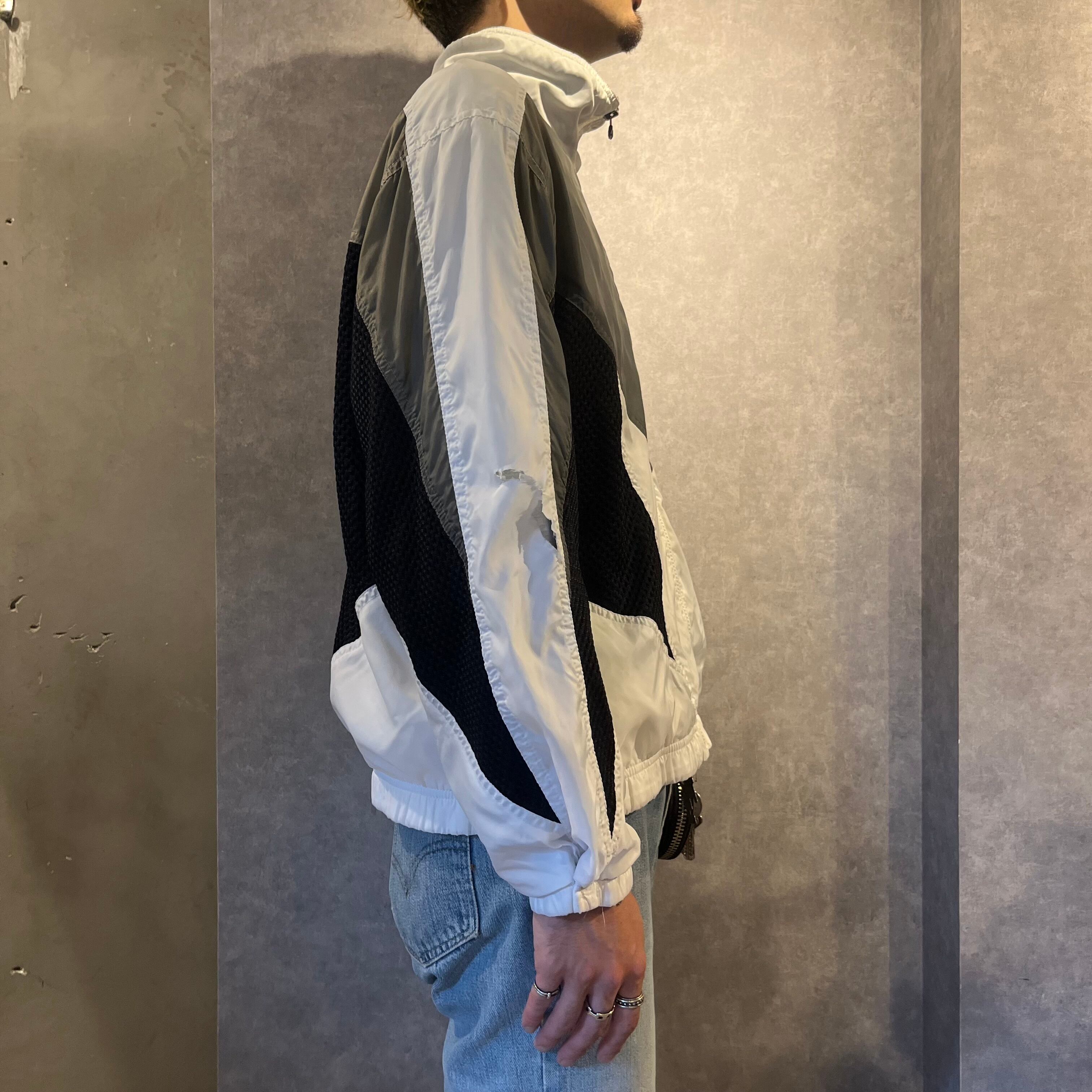 90’sのナイキ製ナイロンジャケットになります。胸元のスウォッシュロゴが大きく90’sならではのデザイン。白、グレー、ブラックの三色使いでブラック部分がメッシュ素材になっています。バックのメッシュ部分にも大きくロゴがあるのもポイント。丈が短く、すっきりとした印象の一枚です。