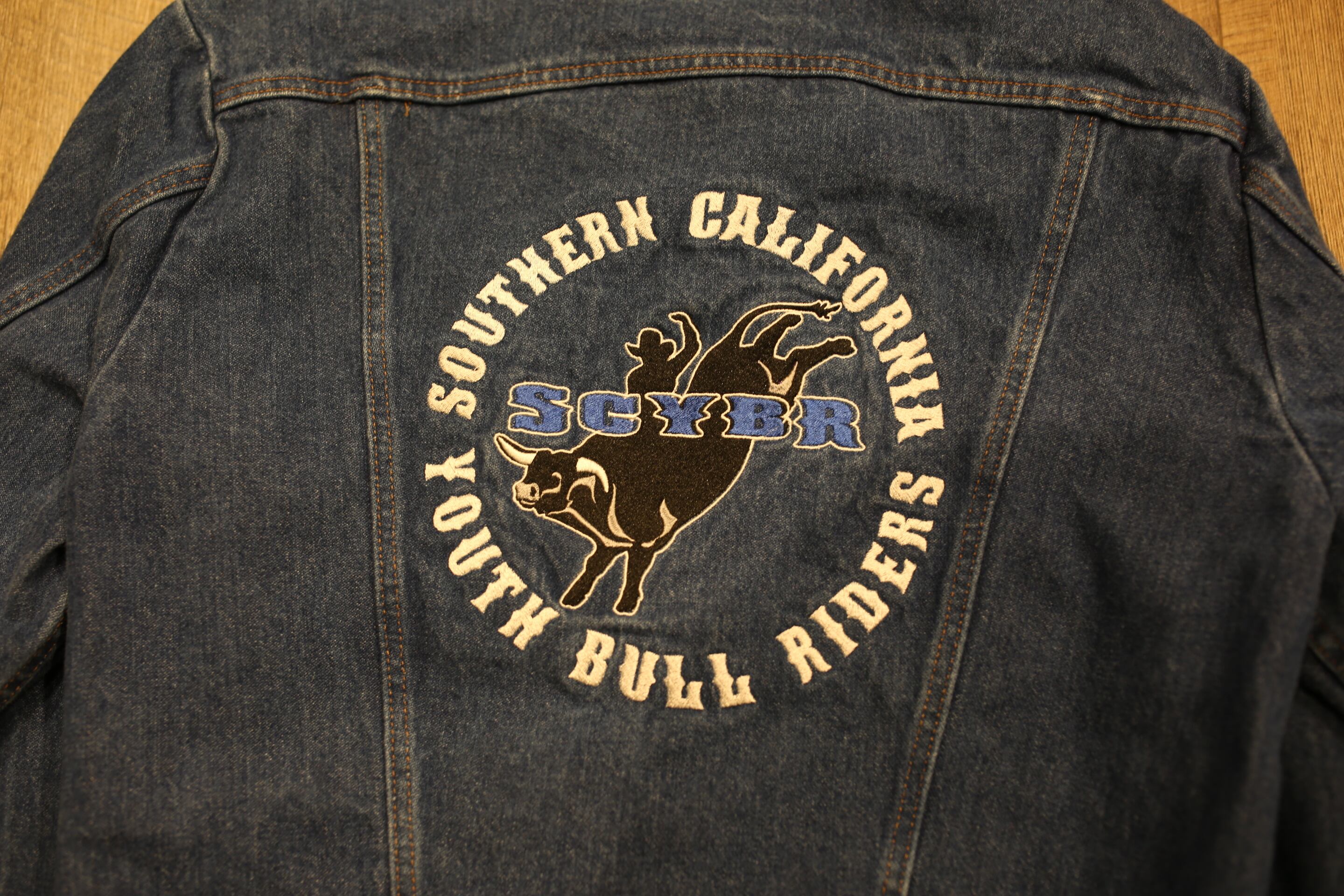 ブルライディング団体の大きなロゴが施され、牛のモチーフが印象的な迫力あるデザイン