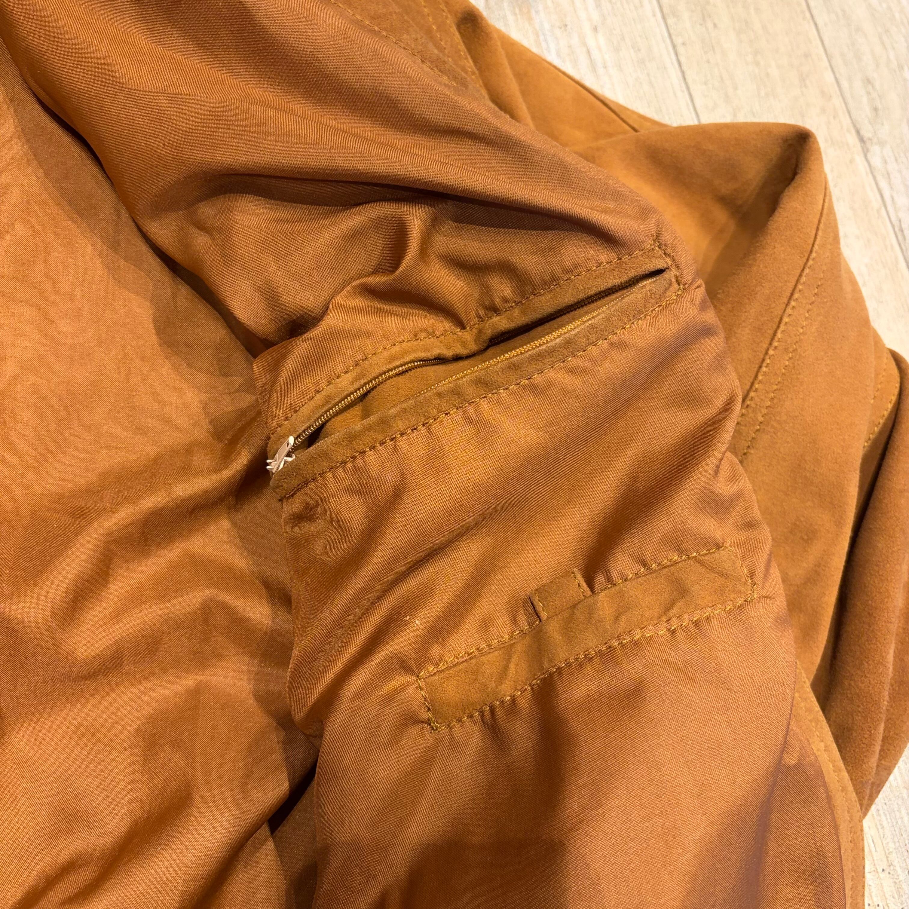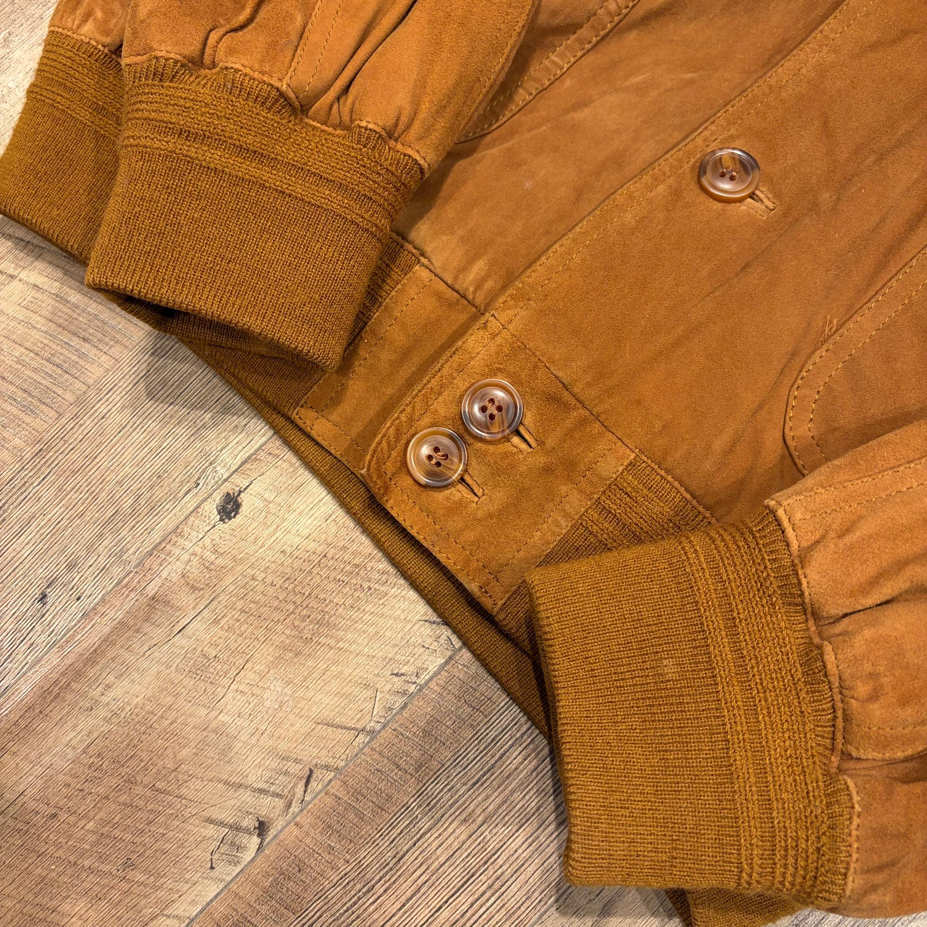 ヨーロッパのデザインに多いボタンタイプのスウェードジャケット。襟、裾、袖がリブになっており程よく要所を締めてくれてメリハリのあるデザインになっています。色味の深いブラウンが渋い1着です。
