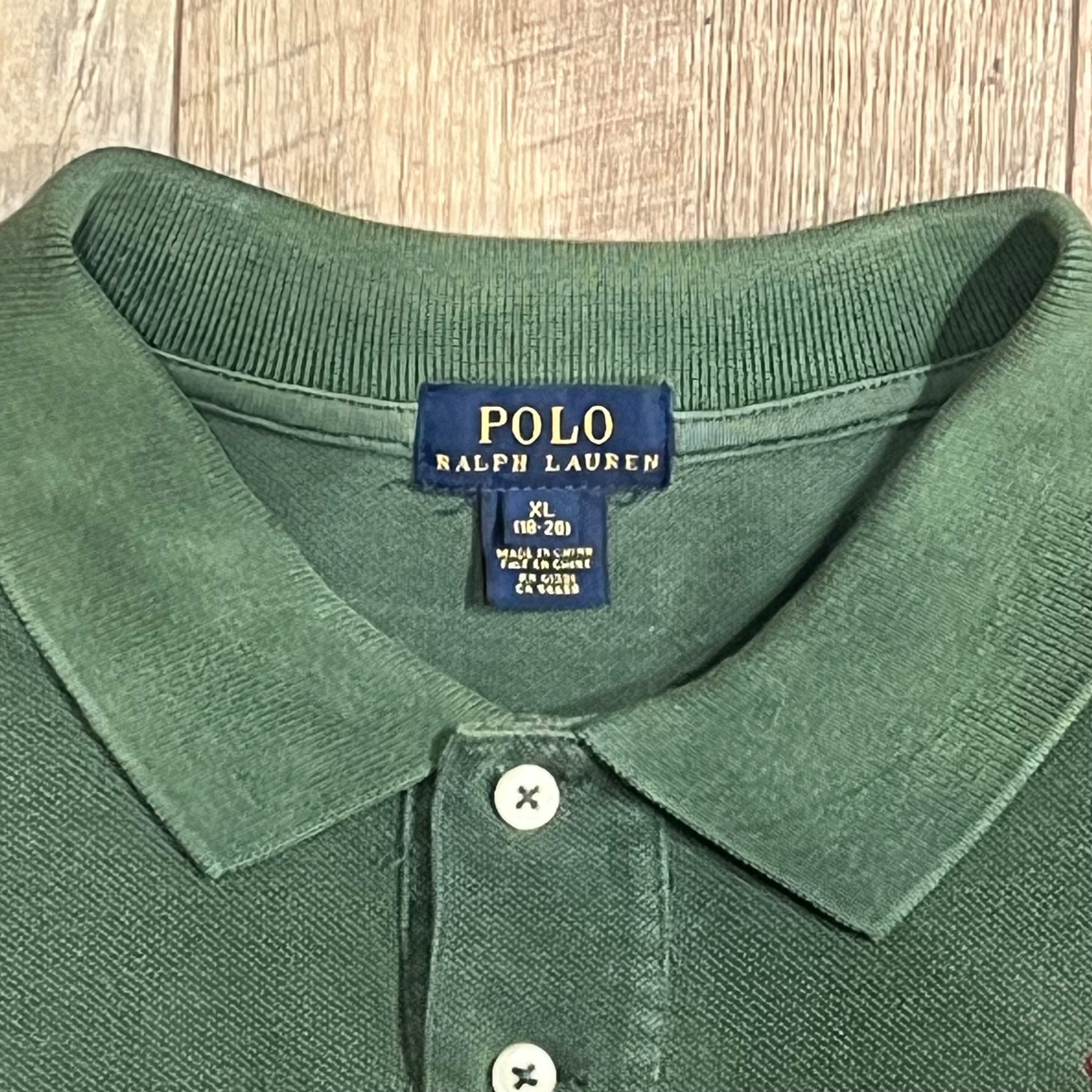 ラルフローレンのラガーシャツ。カーキのボディーにレッドのビックポニーが映える一枚。