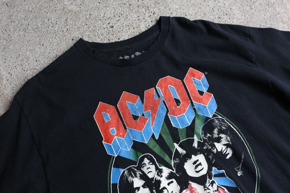 ヴィンテージ市場では、目をひくキャッチーなロゴでAC/DCのTシャツはもちろんそのロゴをバイカー、スケートブランドなどがリスペクトを込めてパロディーが出るなどファッション界へ与えた影響も大きいです。